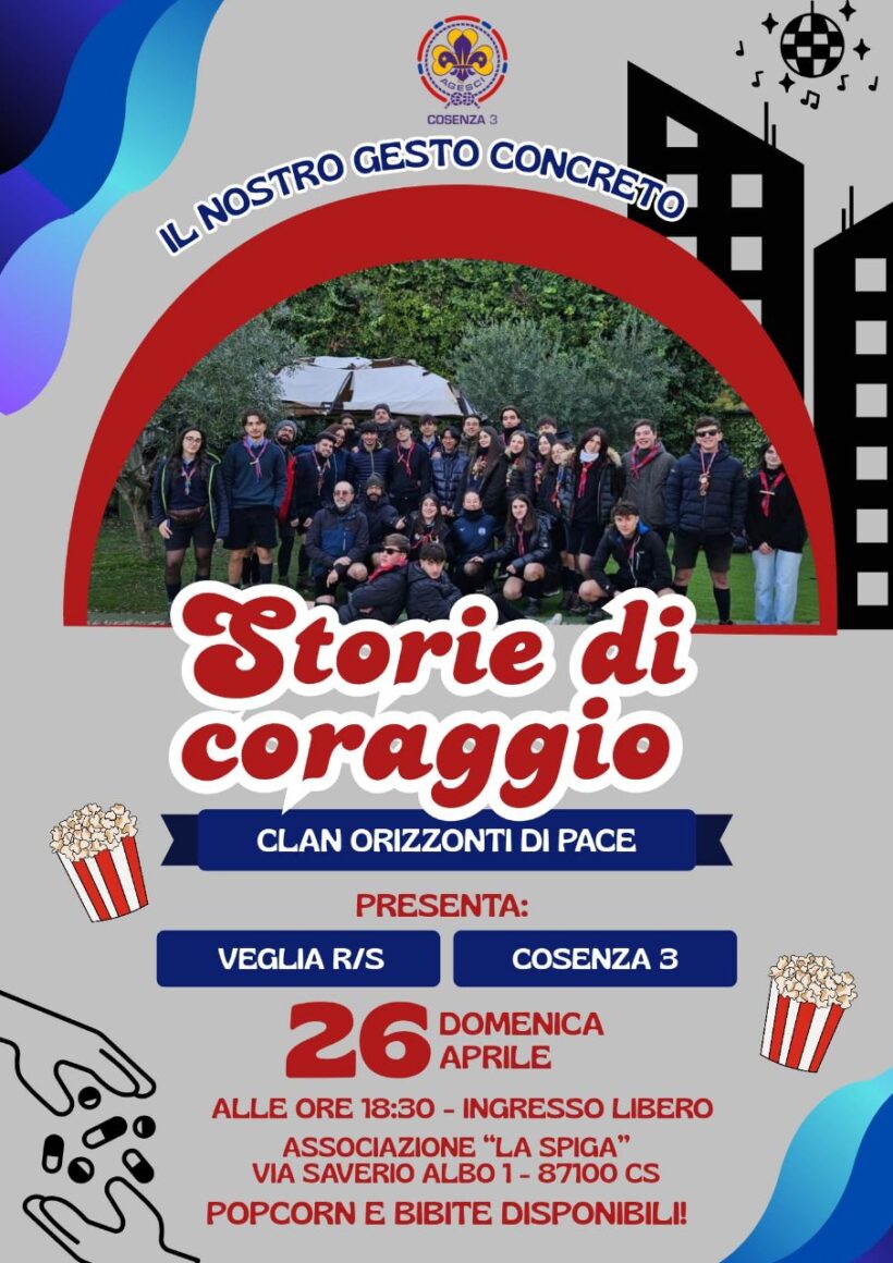 Il Clan “Orizzonti di Pace” del Cosenza 3 vi invita per vivere insieme una serata speciale, il gesto concreto a conclusione del capitolo “Storie di Coraggio”. Una veglia R/S che sarà occasione per stare insieme e riflettere su diverse tematiche. Ci vediamo: […]